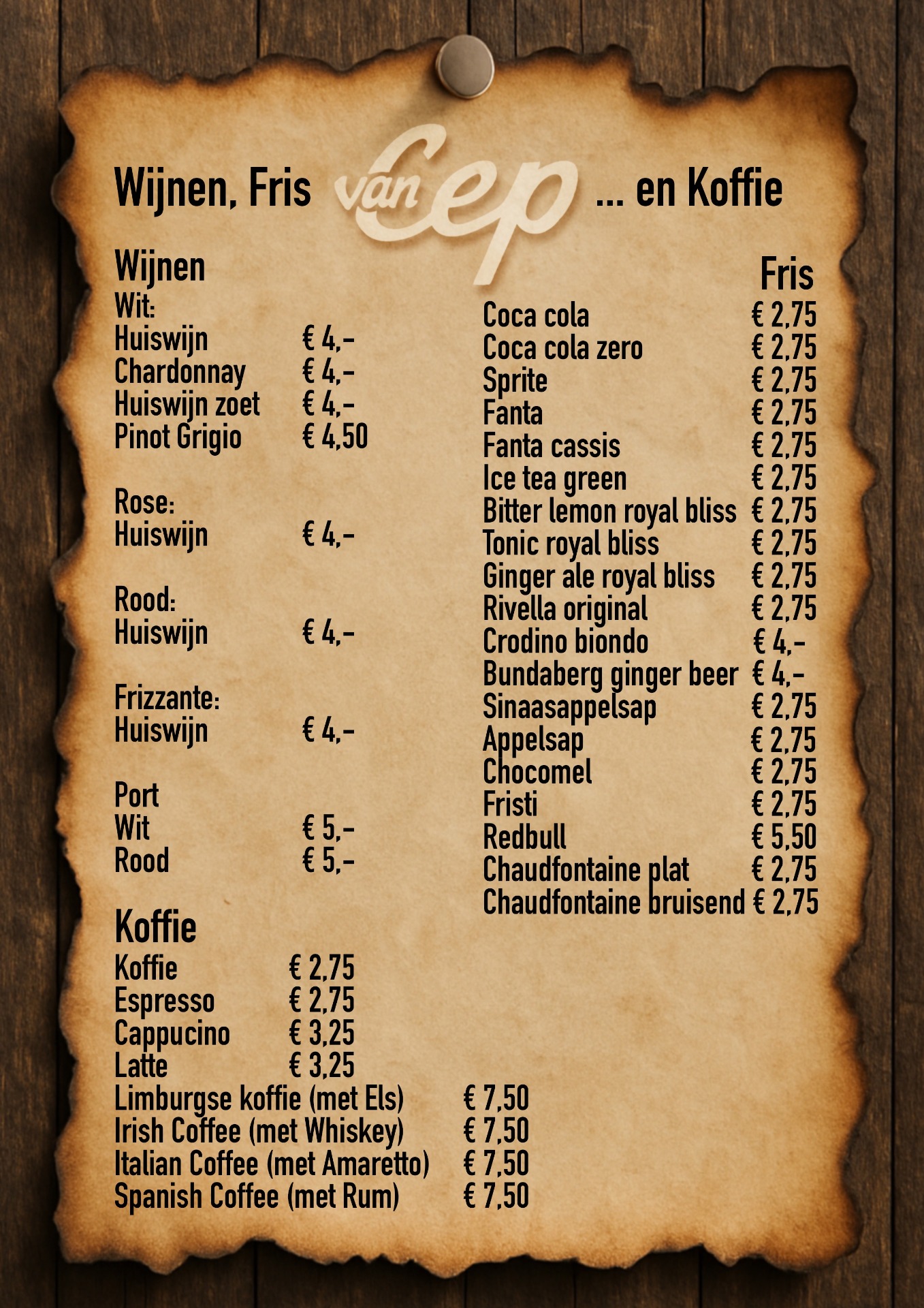 Beste gasten, Welkom bij VanCep, het gezelligste bruin café in Amstenrade! Wij zijn er trots op om jullie te voorzien van een heerlijke avond uit, met goede muziek en uiteraard een uitgebreide drankkeuze. Want bij ons staat de bar altijd vol met de beste bieren, wijnen en sterke dranken.